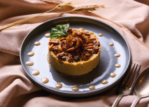 Fıstıklı bonfile küpleri ve karamelize soğan ile / served with sautéed peanut and beef cubes and caramelized onion