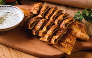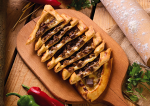 Kıymalı Bafra Pidesi iri kıyım cacık ile / Bafra Pita with ground meat served with Cacık