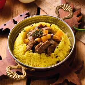 Dane-i Saru eşliğinde bademli dana kavurma / Sauteed beef cubes with almond served with saffron plof